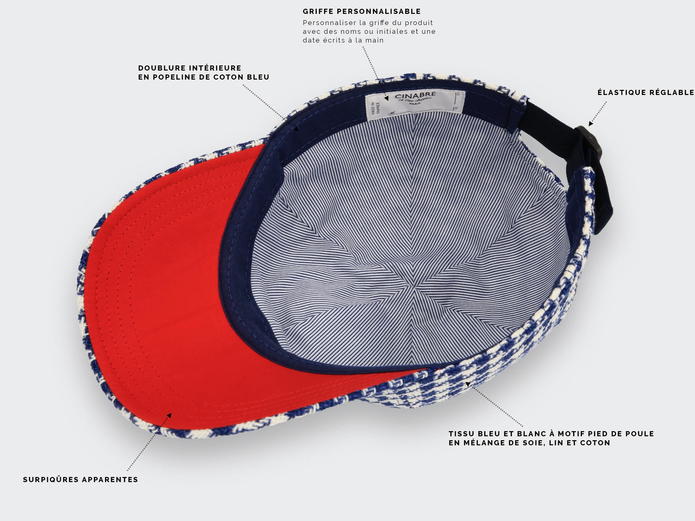 Houndstooth fabric is a blend of silk, linen and matt cotton. This very special composition results in a light fabric with a slightly mottled appearance and a certain sheen but no shine. The tone-on-tone embroidery thread is also cotton. The visor is lined with CINABRE's signature red silk twill. A navy blue elastic band adjusts the size at the back. The elastic is made in England by the same company that supplies the insignia for the Order of the British Empire. The inside of the cap is fully lined for added structure and silhouette. You'll also find a band of padded cotton reinforcements for added comfort and fit.