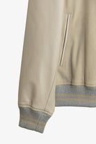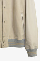 This modern day take on an American college varsity jacket, includes a suede front and back, with tonal leather sleeves and subtle ribbed trimming.